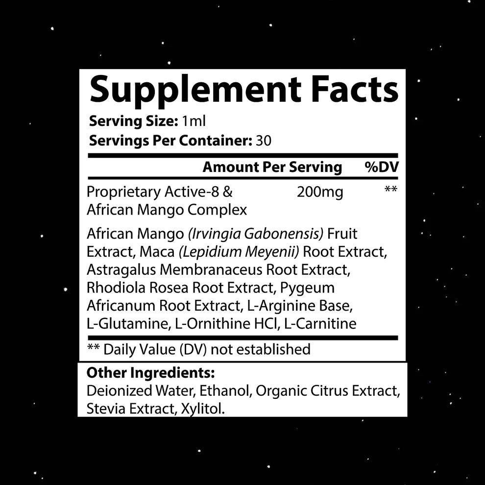 Ingredients: Proprietary Active-8 & African Mango Complex (African Mango Fruit Extract, Maca Root Extract, Astragalus Membranaceus Root Extract, Rhodiola Rosea Root Extract, Pygeum Africanum Root Extract, L-Arginine Base, L-Glutamine, L-Ornithine HCL, L-Carnitine, Deionized Water, Ethanol, Organic Citrus Extract, Stevia Extract, Xylitol.