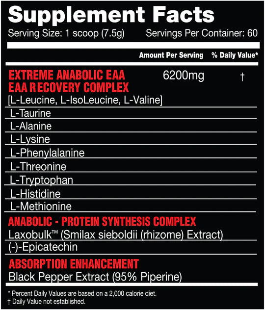 KILLER LABZ BRUTE EAA CONTAINS A FULL 6G OF AMINO ACIDS IN EVERY SERVING, INCLUDING YOUR BRANCH CHAINED AMINO ACIDS, THE REMAINING 6 ESSENTIAL AMINO ACIDS AND TAURINE FOR PERFORMANCE.