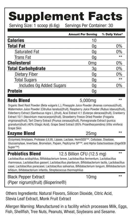 Rejuvenate your day with Project#1 Nutrition Reds, your go-to superfood blend brimming with antioxidants from nature's finest red fruits and berries. Designed to combat oxidative stress and support digestion with a unique enzyme and probiotic mix, our Reds powder infuses your routine with vitality. Delight in the delicious Mango and Pomegranate Raspberry flavors as you effortlessly enrich your wellness journey. It's not just a supplement; it's your daily antioxidant armor, empowering a healthier, fuller life.